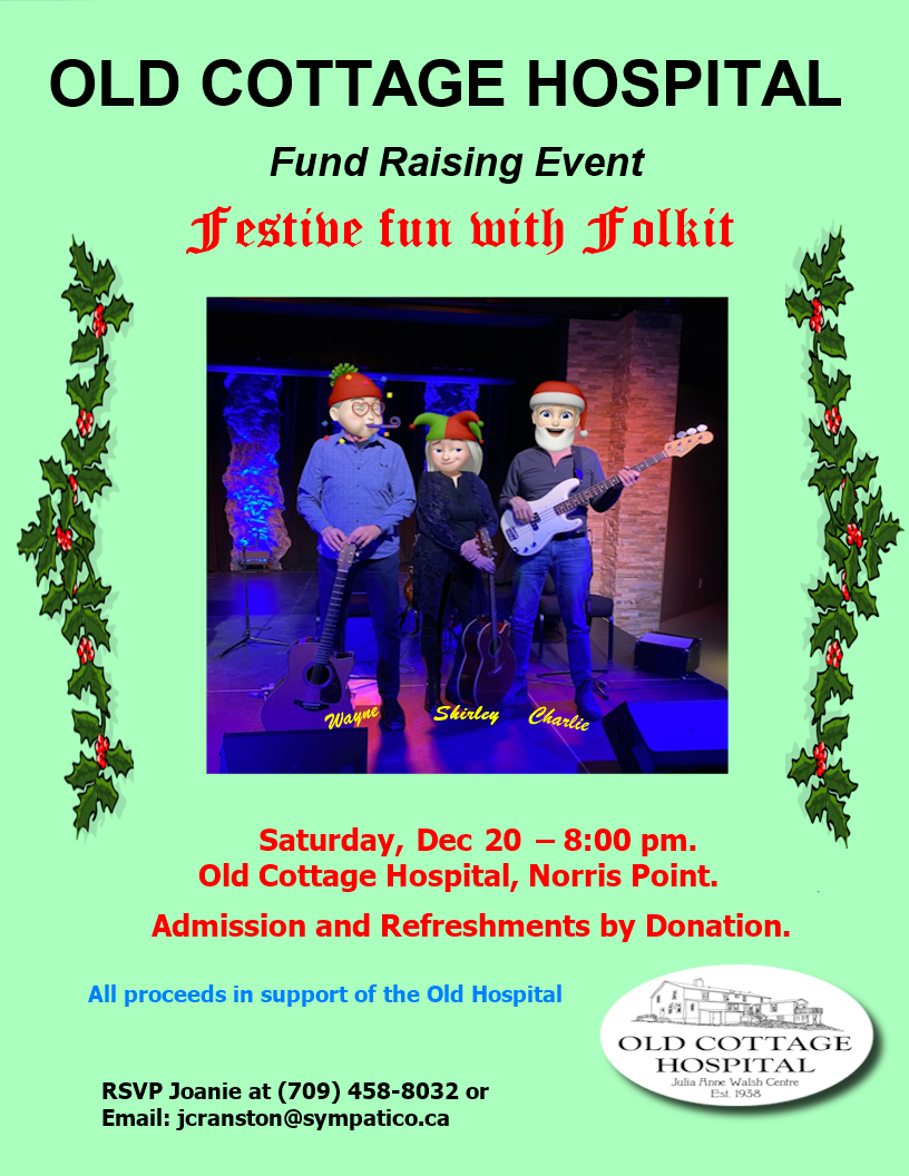 December is here and winter has arrived! We are very pleased to be hosting Folkit for a Christmas gathering on Saturday December 20th at 8:00. They have very generously offered to do this as a fundraiser for the Old Cottage Hospital. Please come and enjoy the chance to gather before Christmas, and enjoy the music. Admission and refreshments by donation, featuring offerings from Chef Dani and the Farmer’s Kitchen (Laurie Haycock).